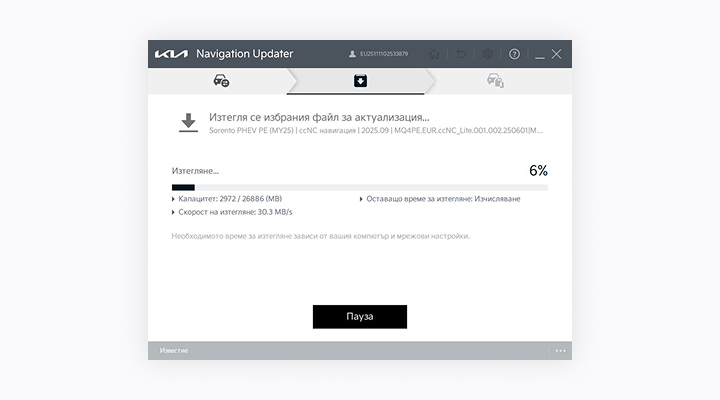 - Внимание: Ако за захранване използвате акумулатора на автомобила, проверете дали в него има достатъчно заряд, преди да започнете актуализацията.