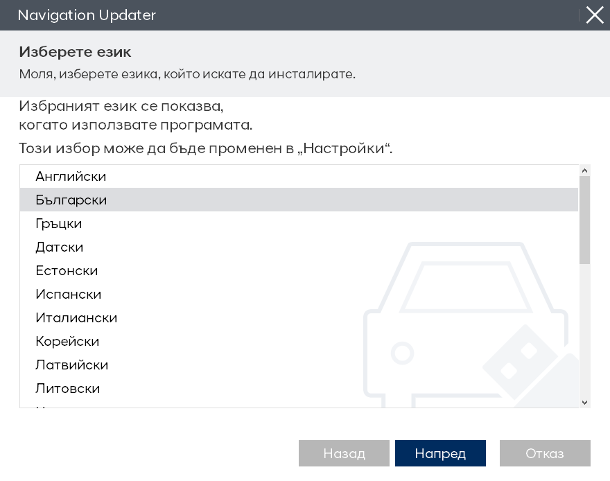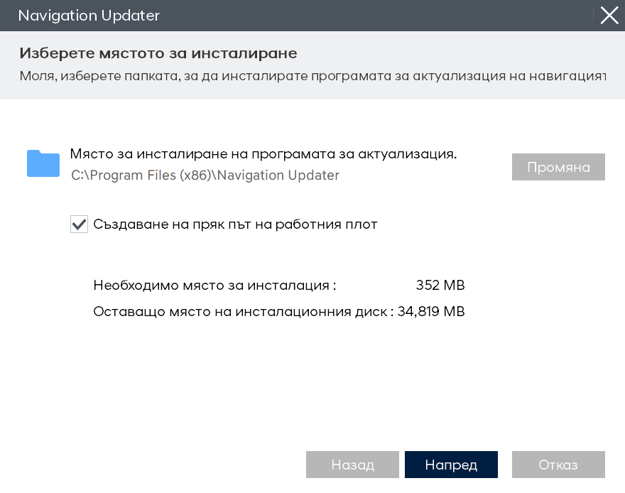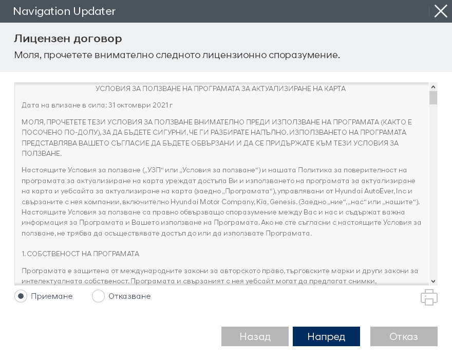 Когато инсталацията на програмата завърши, прегледайте условията на лицензионното споразумение и правата за използване на актуализацията на софтуера за навигация, поставете отметка за потвърждение и съгласие, и след това натиснете бутона „Напред“.