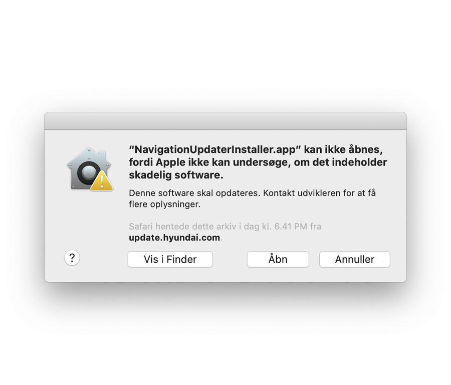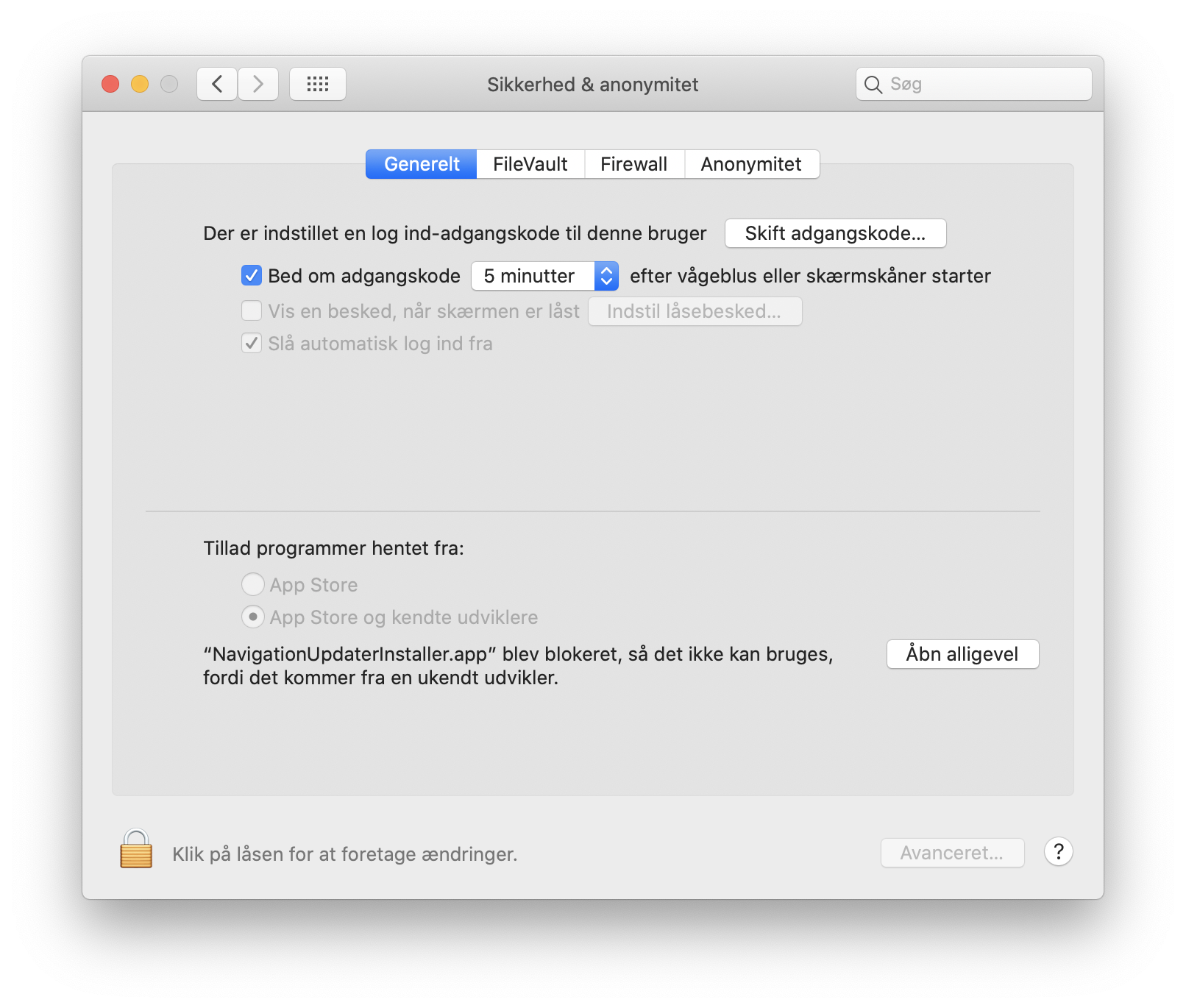 I [Sikkerhed og privatliv] > [Generelt] > [Tillad apps downloadet fra] skal du klikke på knappen "Åbn alligevel".