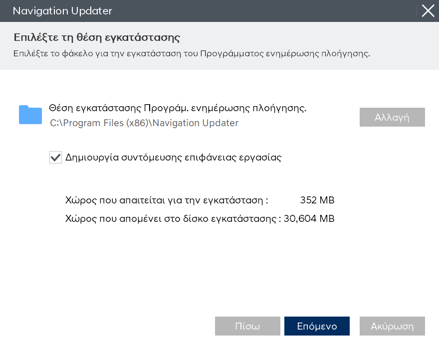 - ※ Εάν ο υπολογιστής το αναγνωρίσει ως τοπικό δίσκο αντί για αφαιρούμενο δίσκο, η αντιγραφή αρχείων μέσω του Navigation Updater ενδέχεται να μην προχωρήσει.