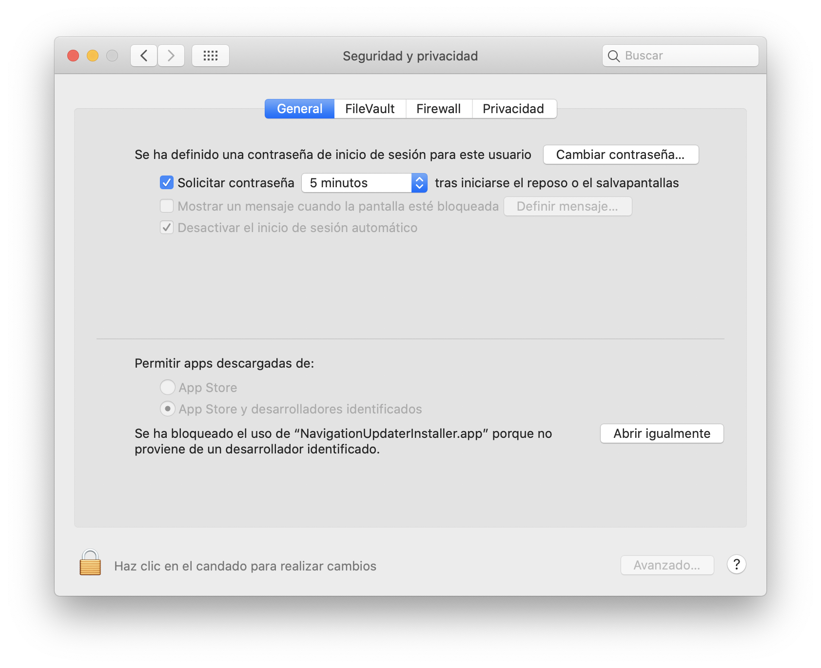 En [Seguridad y privacidad] > [General] > [Permitir aplicaciones descargadas de], haga clic en el botón "Abrir de todos modos".