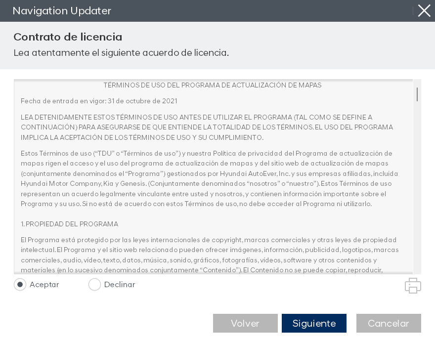 Una vez finalizada la instalación del programa, revise los términos del acuerdo de licencia y los derechos de uso del software de actualización de navegación, marque la casilla de confirmación y aceptación, y luego haga clic en el botón "Siguiente".