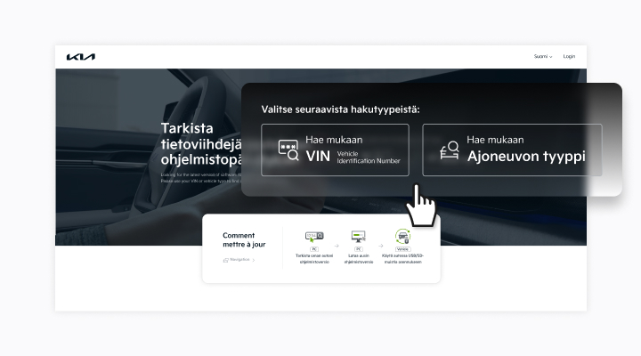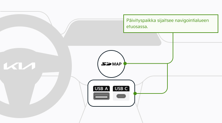 "Vie kannettava laite (USB) ajoneuvoon ja jatka päivitystä.Ohjeet ovat alla."