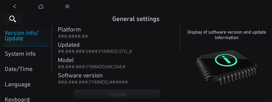 Sélectionnez « Software info/update » dans l'écran General, puis appuyez sur le bouton « Update » pour procéder à la mise à jour