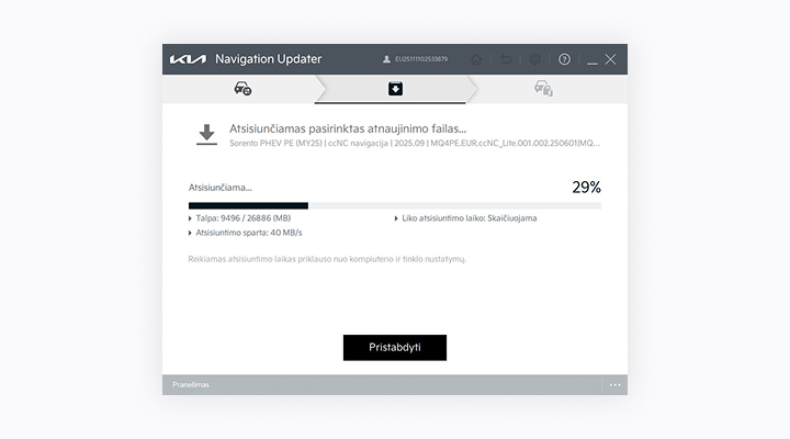 Patikrinkite, ar transporto priemonės akumuliatorius yra pakankamai įkrautas, kad navigacijos sistema neatsijungtų atnaujinimo metu.