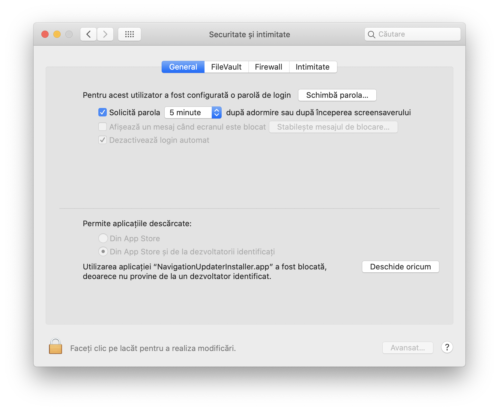 În [Securitate și confidențialitate] > [General] > [Permitere aplicații descărcate din], faceți clic pe butonul „Deschideți oricum”.