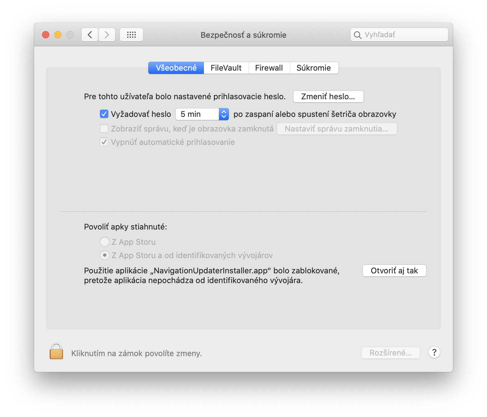 V časti [Zabezpečenie a súkromie] > [Všeobecné] > [Povoliť aplikácie stiahnuté z] kliknite na tlačidlo „Open Anyway“ (Otvoriť aj tak).