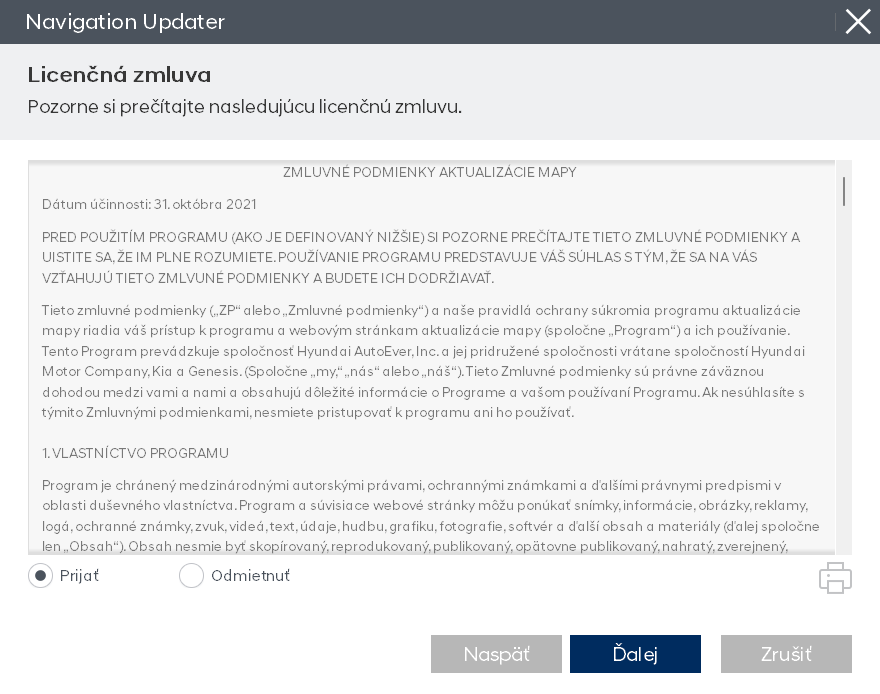Keď je inštalácia programu pripravená, prečítajte si podmienky licenčnej zmluvy a práva na používanie softvéru aktualizácie navigácie, skontrolujte tlačidlo potvrdenia a zmluvy a potom kliknite na tlačidlo „Ďalej“.