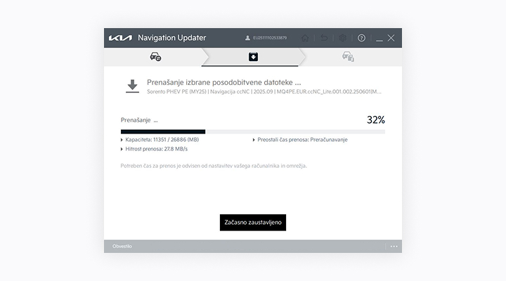 - Previdnost: Če uporabljate napajanje iz akumulatorja vozila, se pred nadaljevanjem posodobitve prepričajte, da je akumulator dovolj napolnjen.