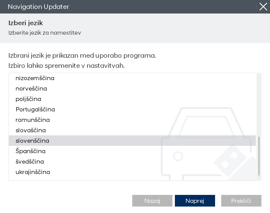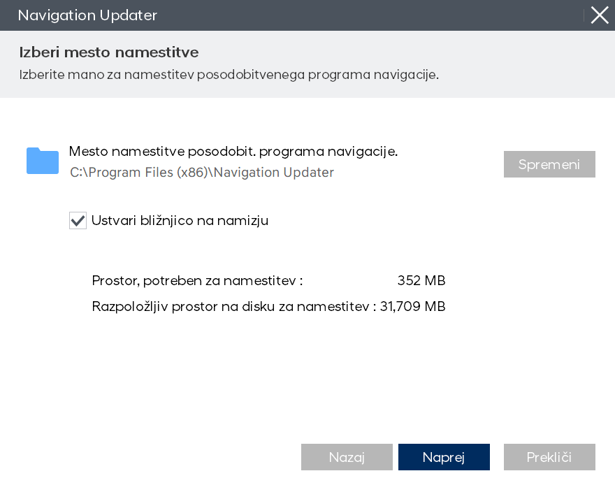 Ko je namestitev programa pripravljena, preglejte pogoje licenčne pogodbe in pravice uporabe programske opreme za posodobitev navigacije, odkljukajte gumb za potrditev in strinjanje ter nato kliknite gumb »Naprej«.