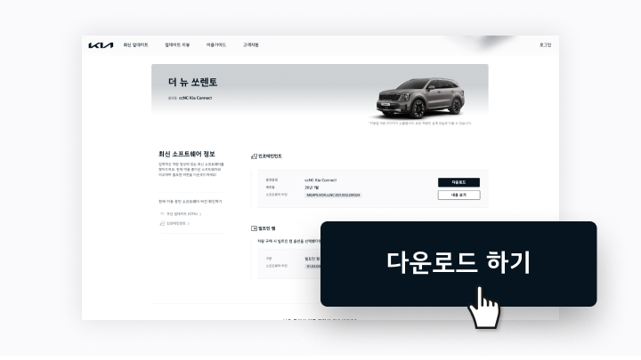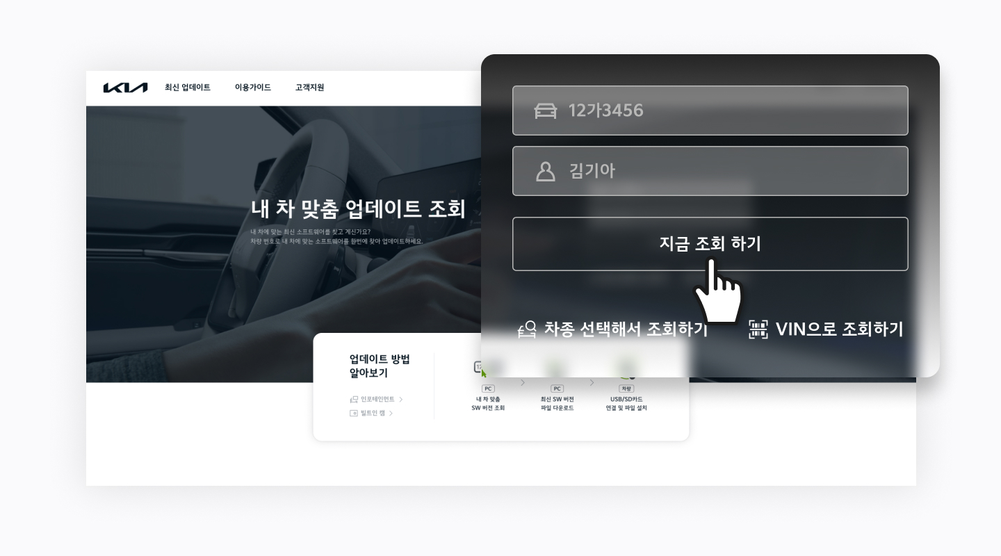- 홈 화면 [내 차 맞춤 업데이트 조회]를 이용해 내 차에 맞는 최신 소프트웨어를 조회합니다.