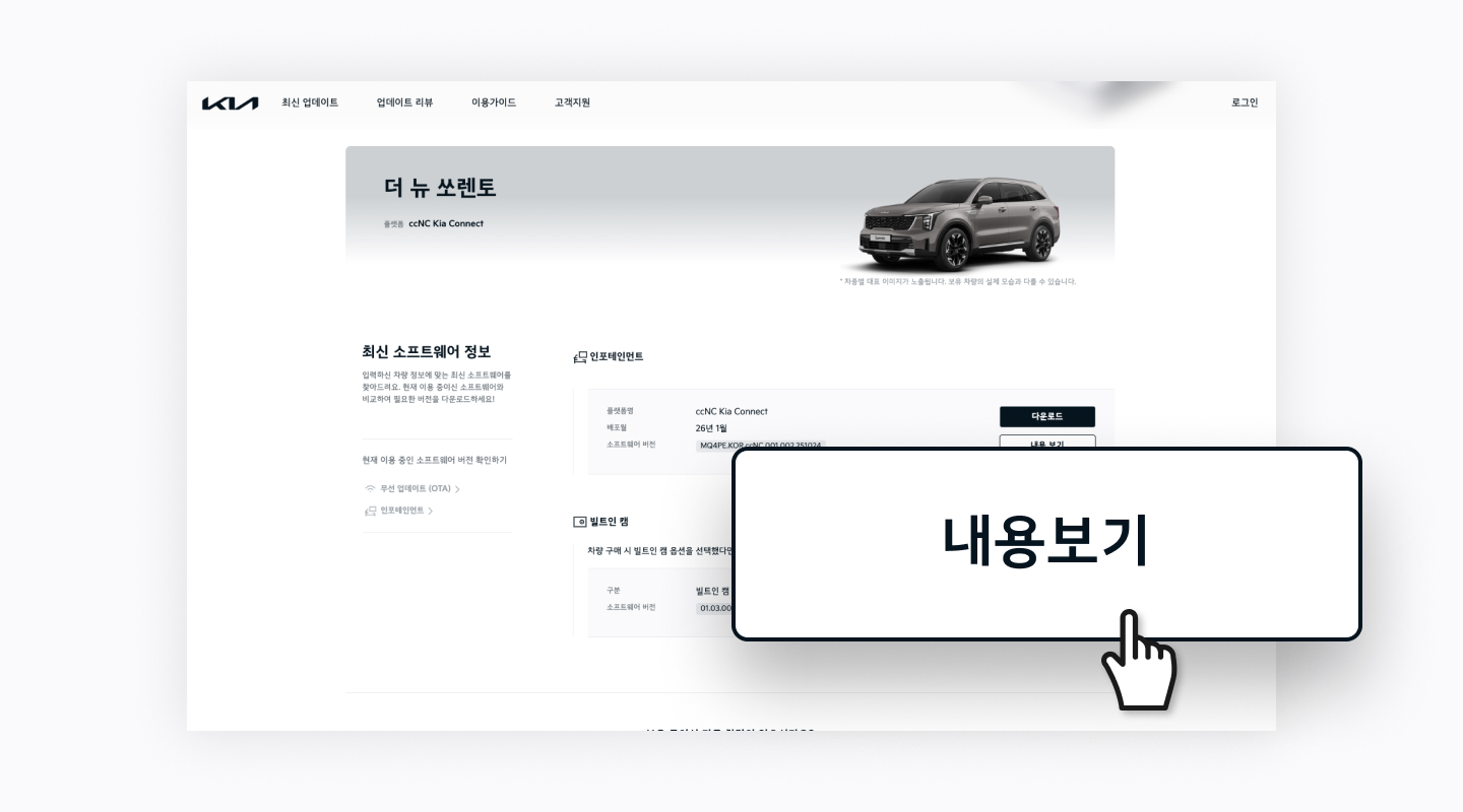 - 업데이트할 소프트웨어의 [내용보기] 버튼을 선택합니다.[다운로드] 버튼 선택 시 즉시 다운로드를 시작할 수 있습니다. (Navigation Updater 실행)