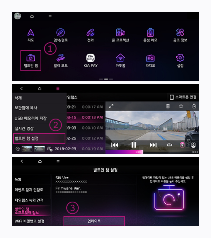 - 내비게이션 전체 메뉴 화면에서 [빌트인 캠] > [빌트인 캠 설정] > [업데이트] 또는 [빌트인 캠 소프트웨어 정보]를 선택한 후, [업데이트]를 선택합니다.업데이트를 진행하는 동안시동을 켜고 기어 P단 정차 상태를 유지해주세요.이동식 저장장치의 연결을 유지해주세요.인포테인먼트 시스템 내 빌트인 캠 선택 화면을 유지해주세요.단, 업데이트 진행 중에는 빌트인 캠 녹화 기능이 작동하지 않습니다.