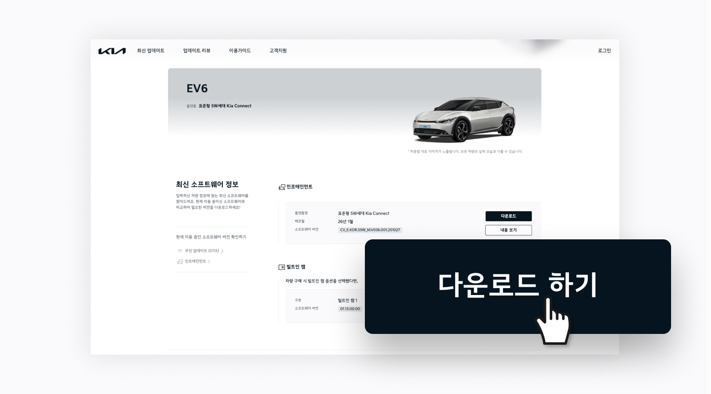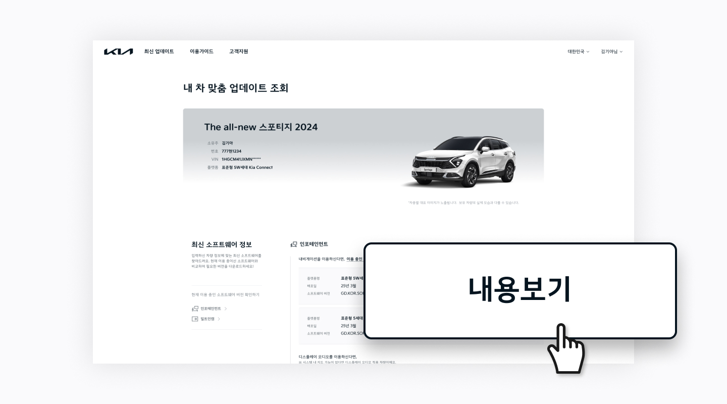 - 홈 화면 [내 차 맞춤 업데이트 조회]를 이용해 내 차에 맞는 최신 소프트웨어를 조회합니다.