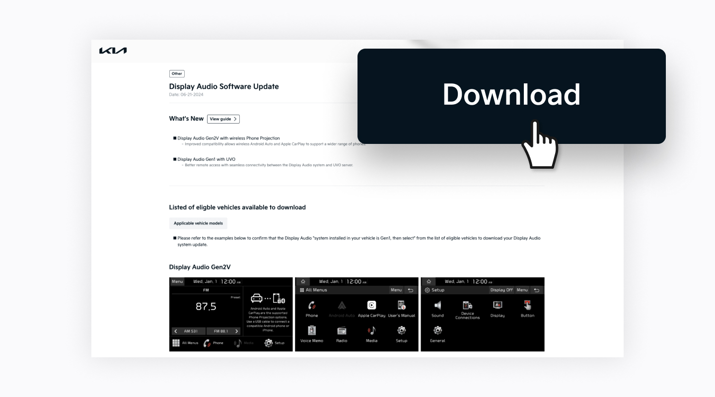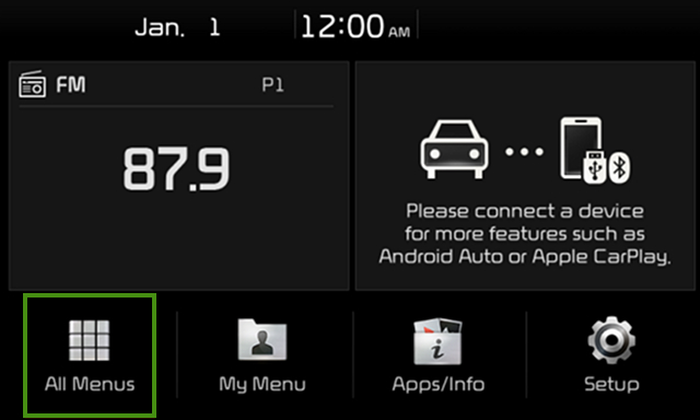 Press the "Setup" key or tap the Setup touchscreen button in the All Menus section of the Display Audio system.