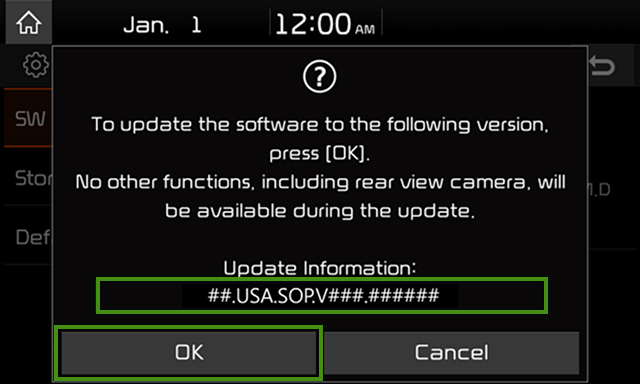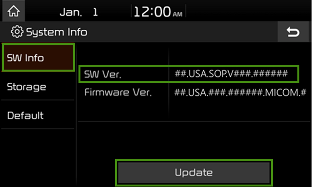- Select [All menus] > [Setup] > [General] > [SW Info/Update], then select [Update].*Depending on the vehicle and specification, your screen may look different from the one shown below.